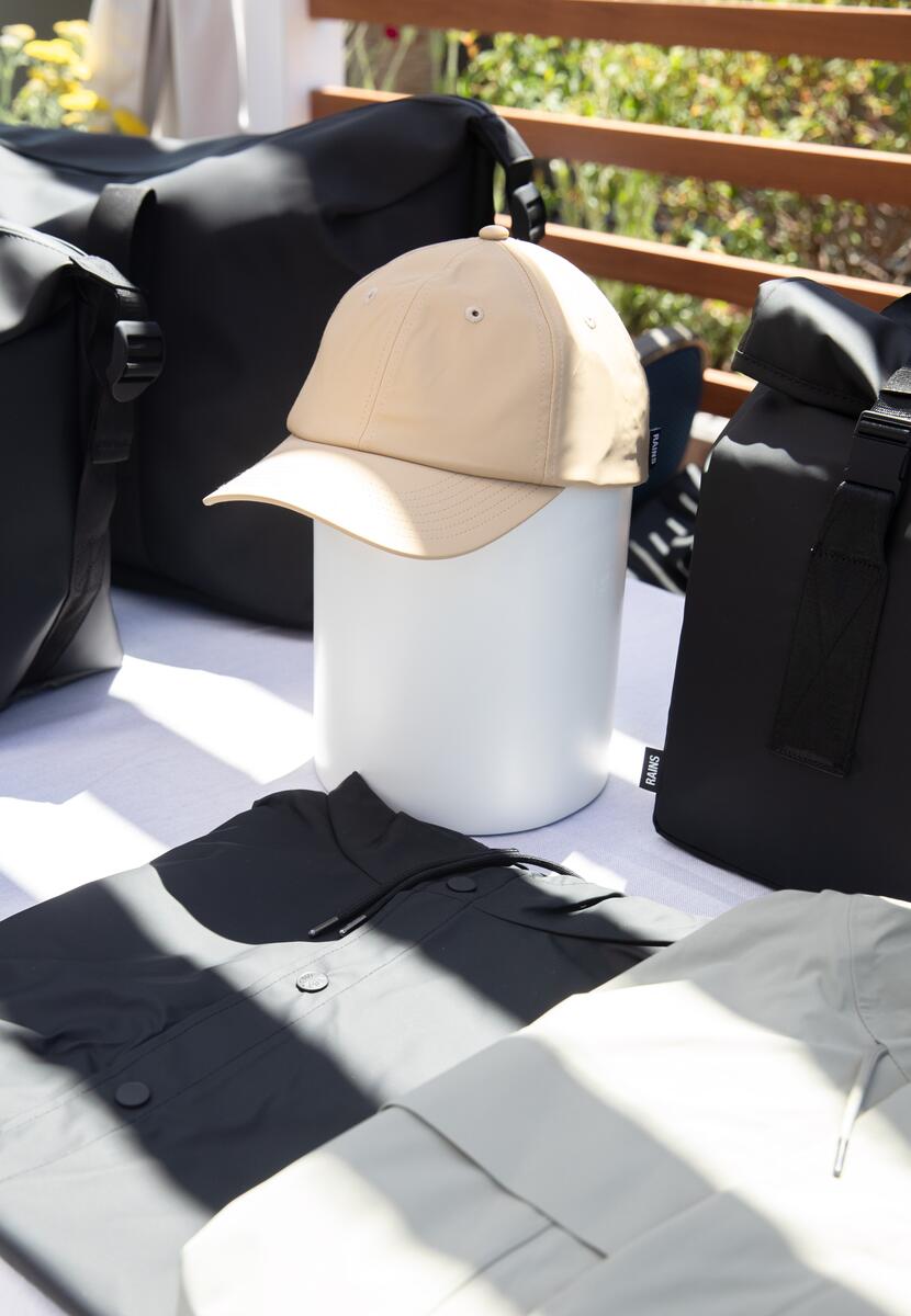 14. Made from RAINs' signature smooth, lightweight PU fabric, the RAINS Cap is secured with an adjustable webbing strap for a custom fit for all.